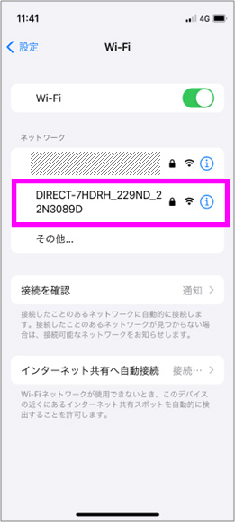 ■「Wi-Fi」をオンにした状態で、「ネットワーク」からドライブレコーダーのSSIDを選択します。