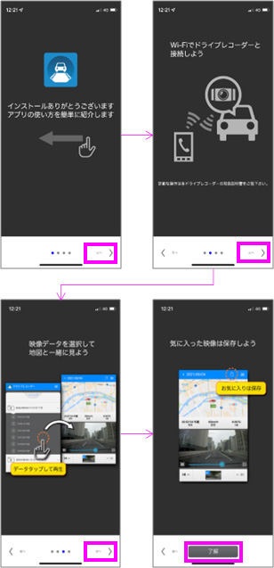 iPhoneに専用アプリをインストールします。ドライブレコーダーとiPhoneをWi-Fi接続後、専用アプリで録画映像を再生します。