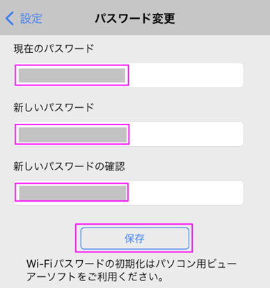 ■「現在のパスワード」、「新しいパスワード」、「新しいパスワードの確認」を入力し、「保存」をタップします。