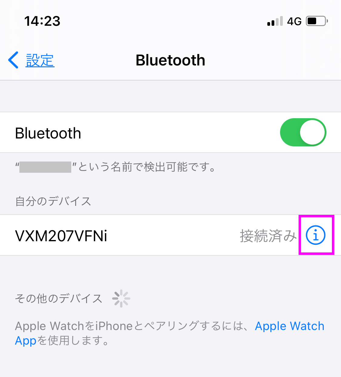 ■iPhoneの[設定]から[Bluetooth]を選び、自分のデバイスで「接続済み」になっているナビゲーションの( i )マークをタップします