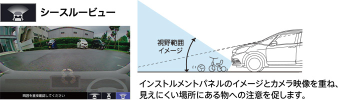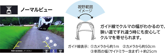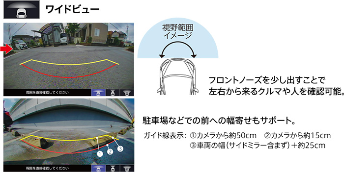 狭い路地や駐車場などでクルマの前方向の視界をサポートします。