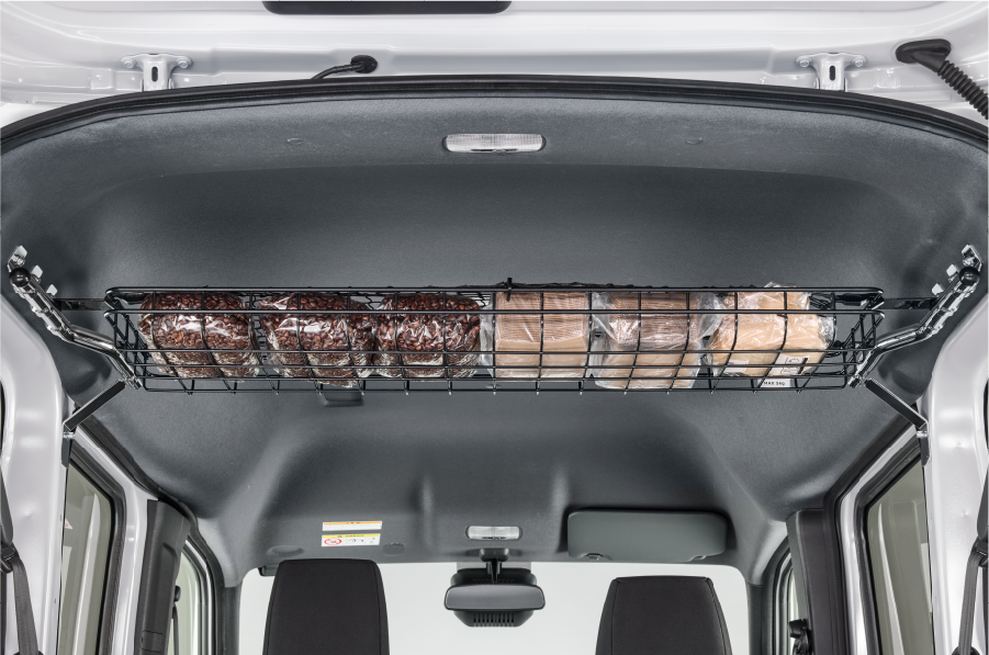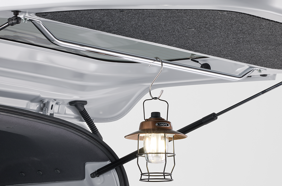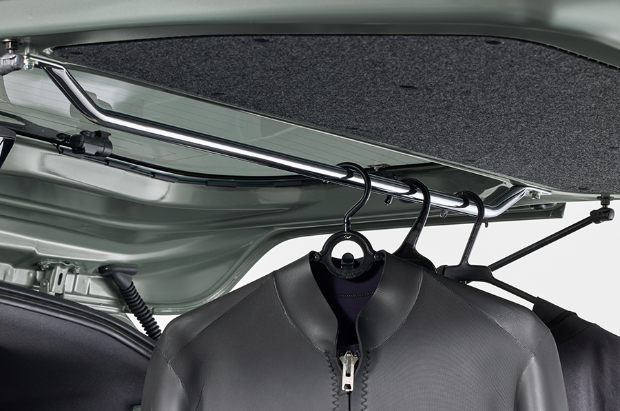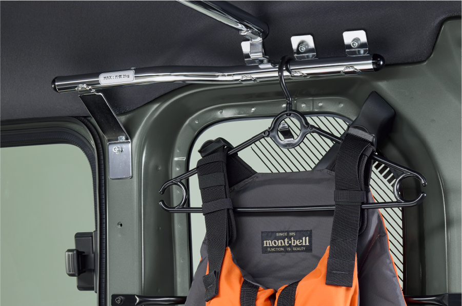 荷室の窓の上にハンガーなどが掛けられ、オプションでクロスバーやラックが装着できます。