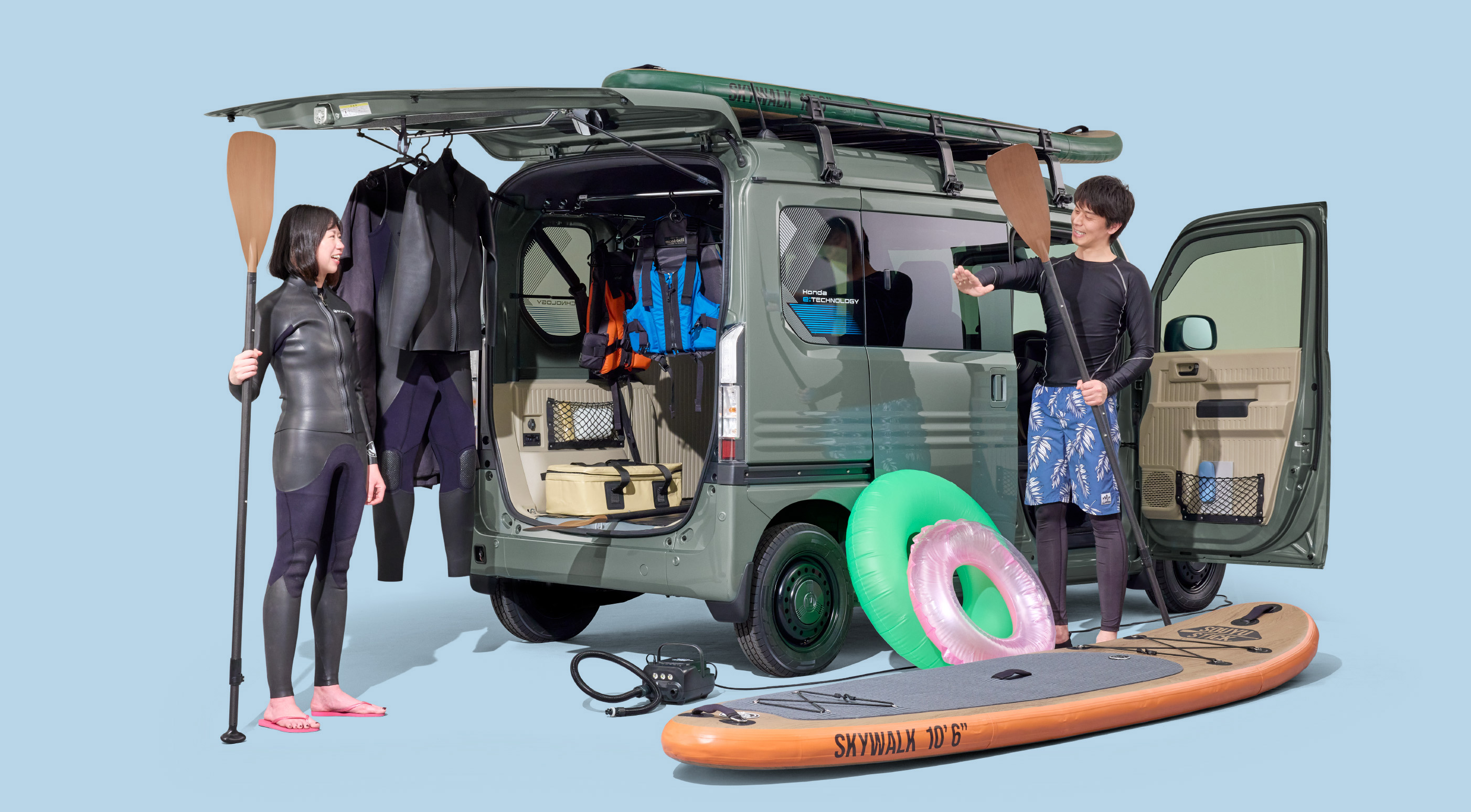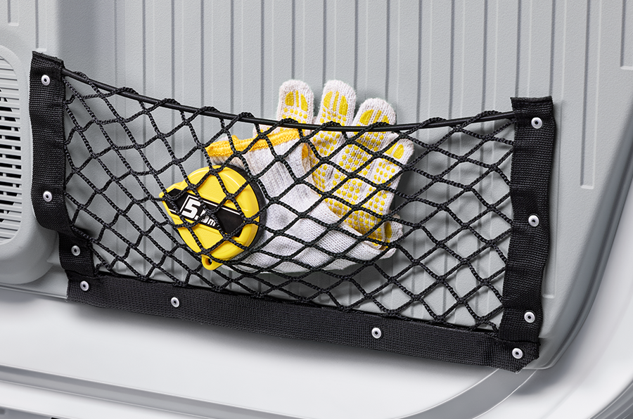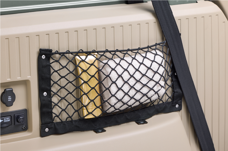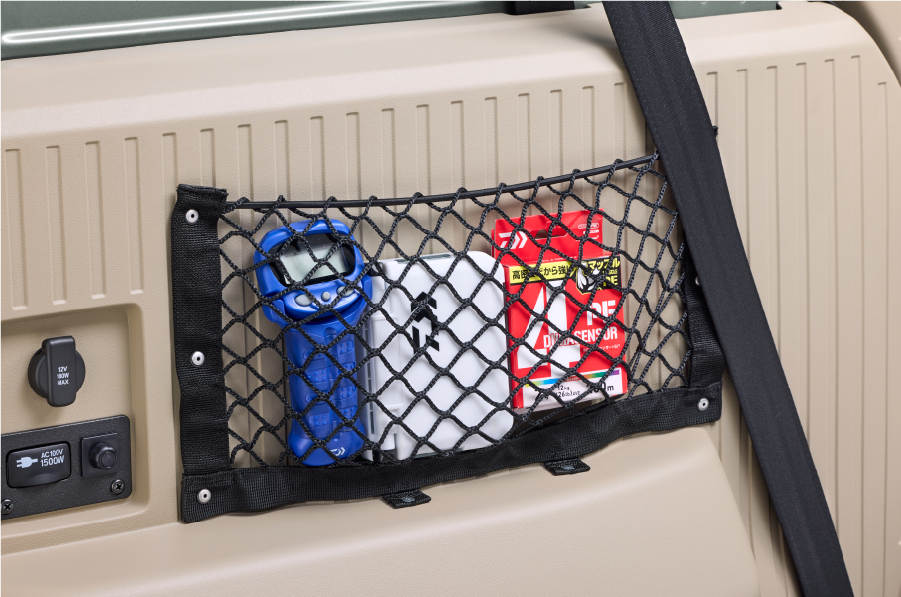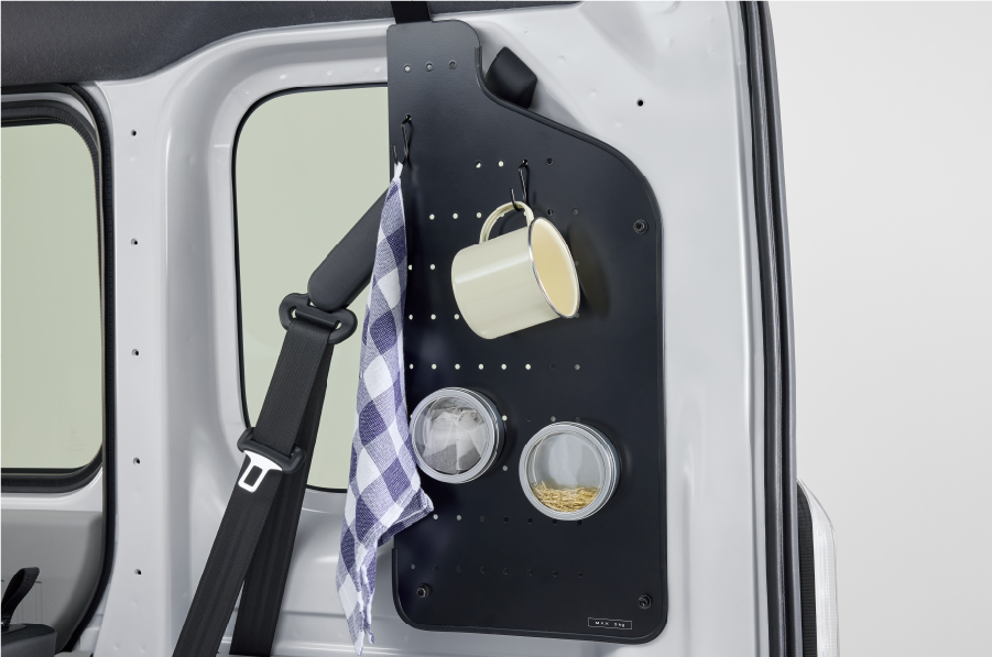 中身が見えて出し入れしやすい壁面収納をプラス。運転席ドアと荷室の壁用の2枚セットです。