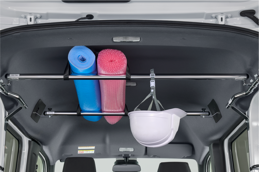 天井の左右にわたして道具を吊るしたり、フロント用も使って前後に2本付ければ長い荷物も収納可能。
