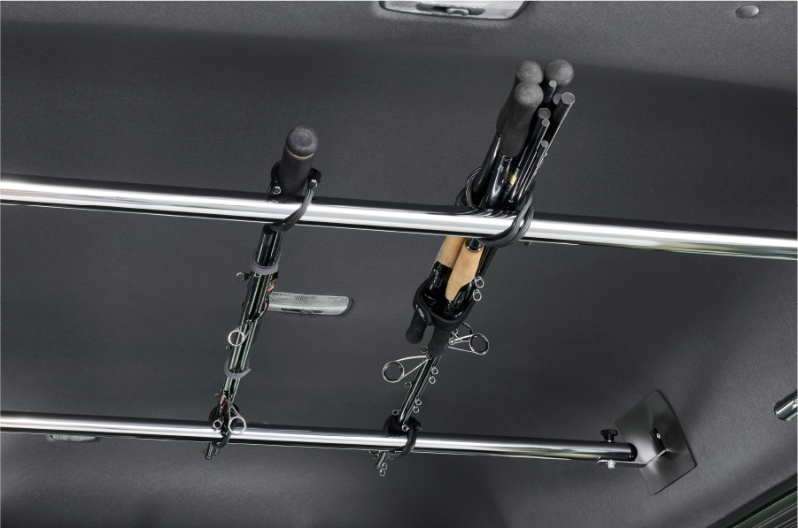 天井の左右にわたして道具を吊るしたり、フロント用も使って前後に2本付ければロッドなども収納可能。