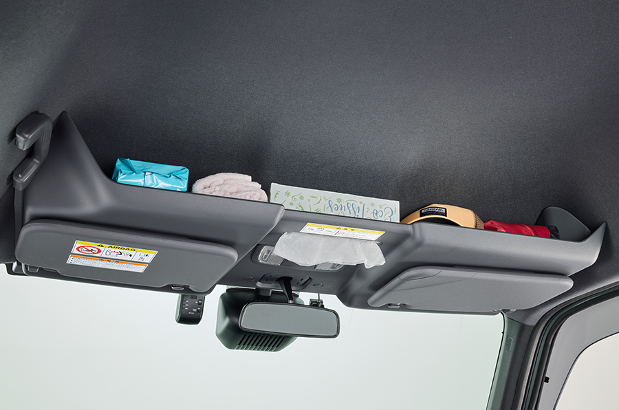 前席のルーフに、よく使うものをサッと出し入れできる収納をプラス。ティッシュもセットできて便利です。
