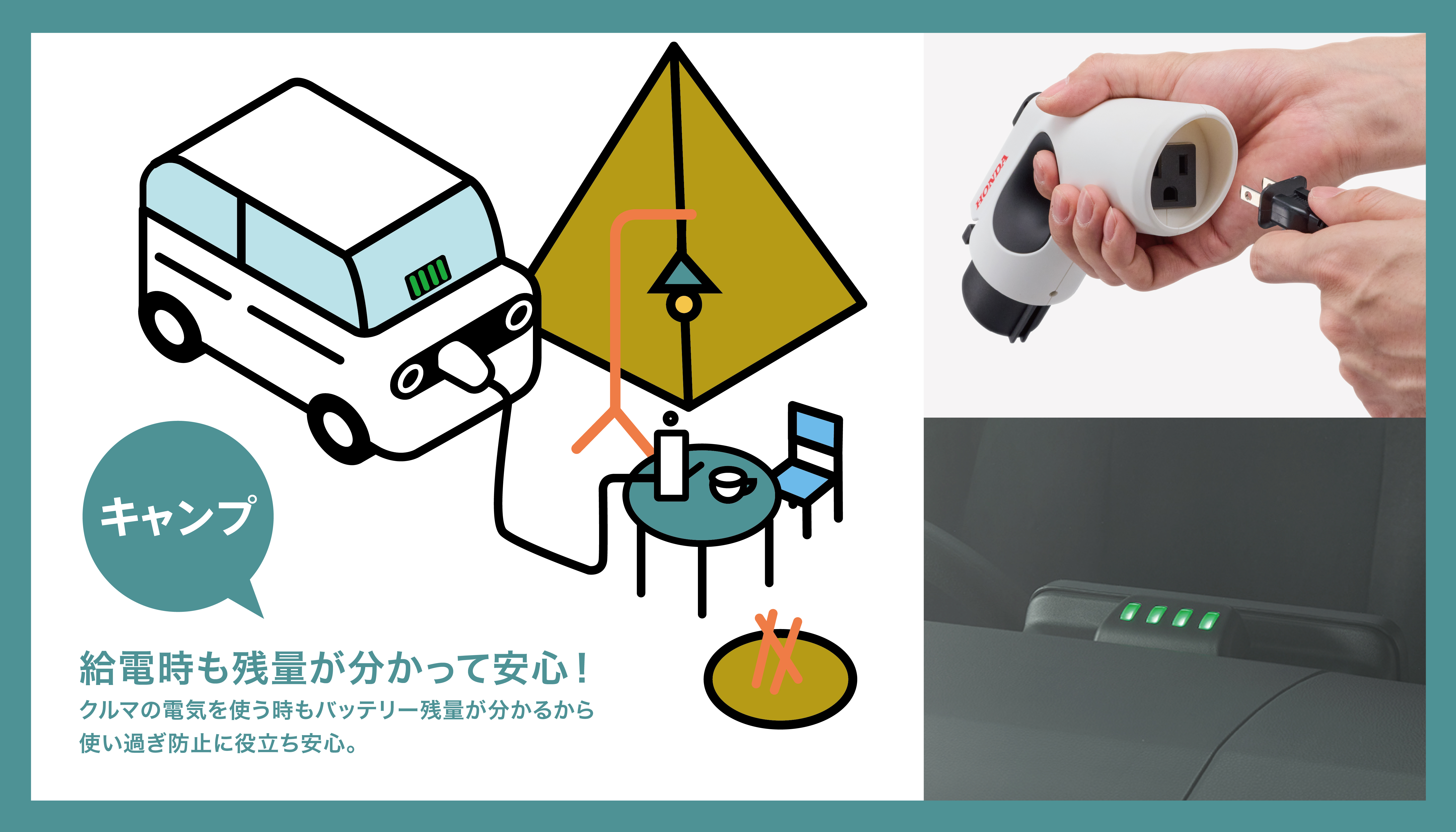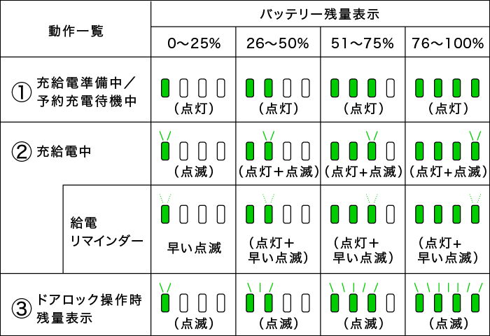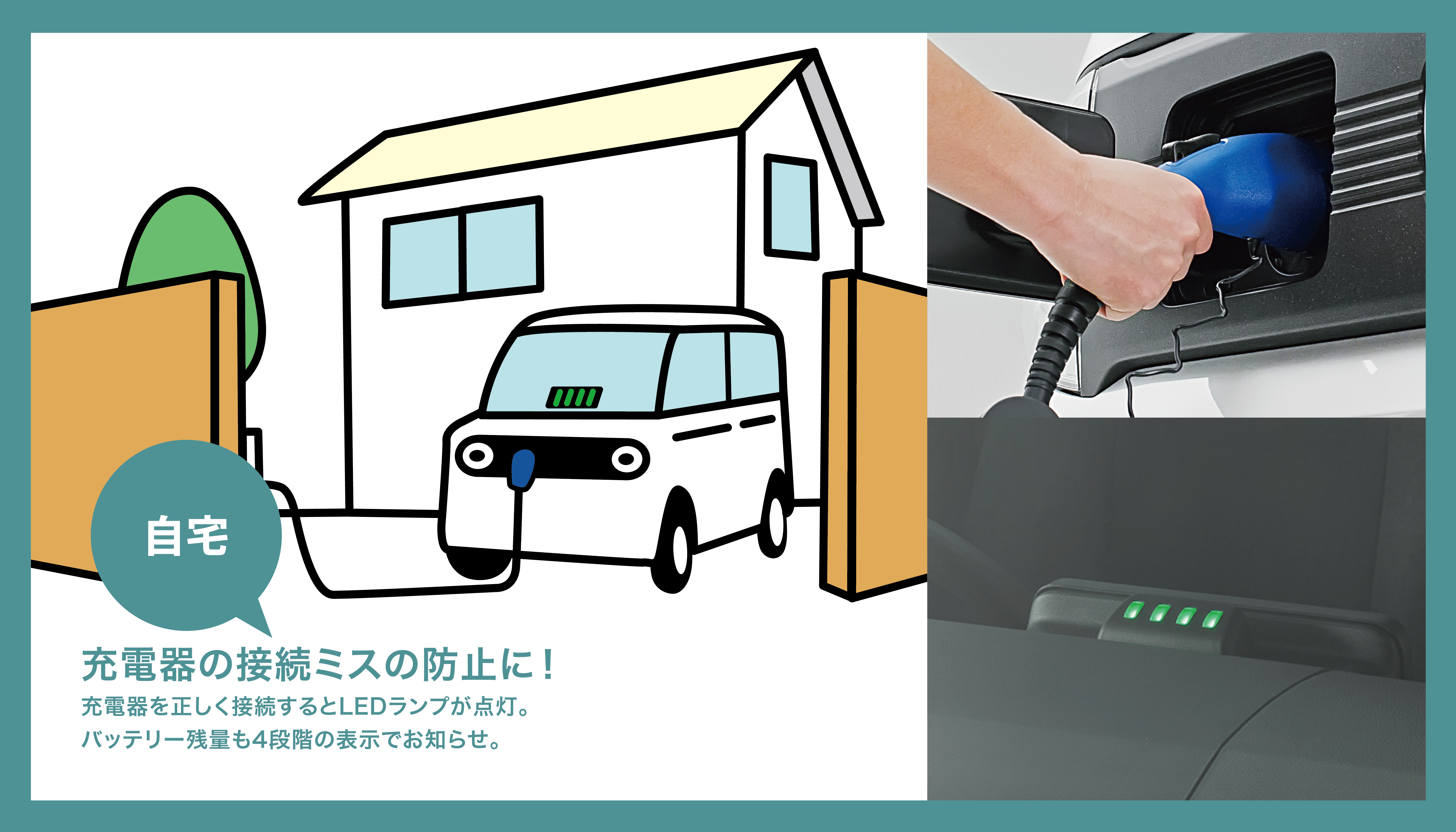 センターパネルの上に取り付け。充電時・給電時・ドアロック操作時に、4段階のLEDランプ表示で車外からでもバッテリーの残量が確認できます。LEDランプが点灯することで、充電器・給電器が正しく接続されているかもひと目でわかり、コネクターの接続ミスの防止にも役立ちます。