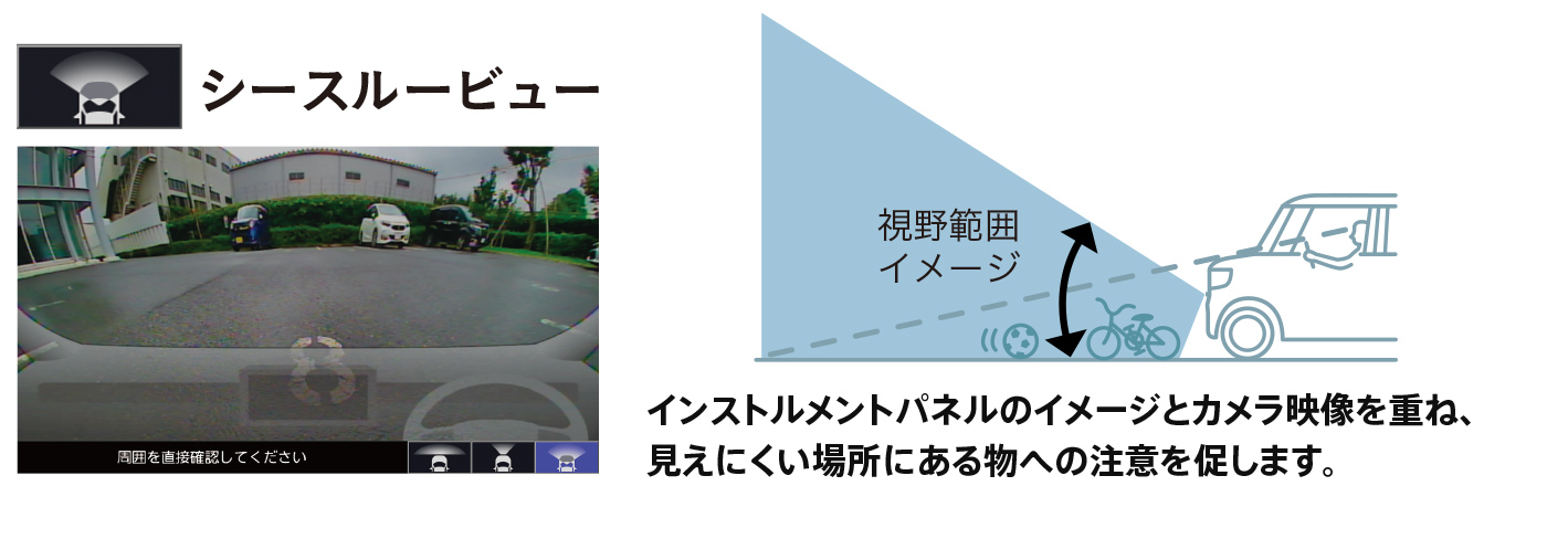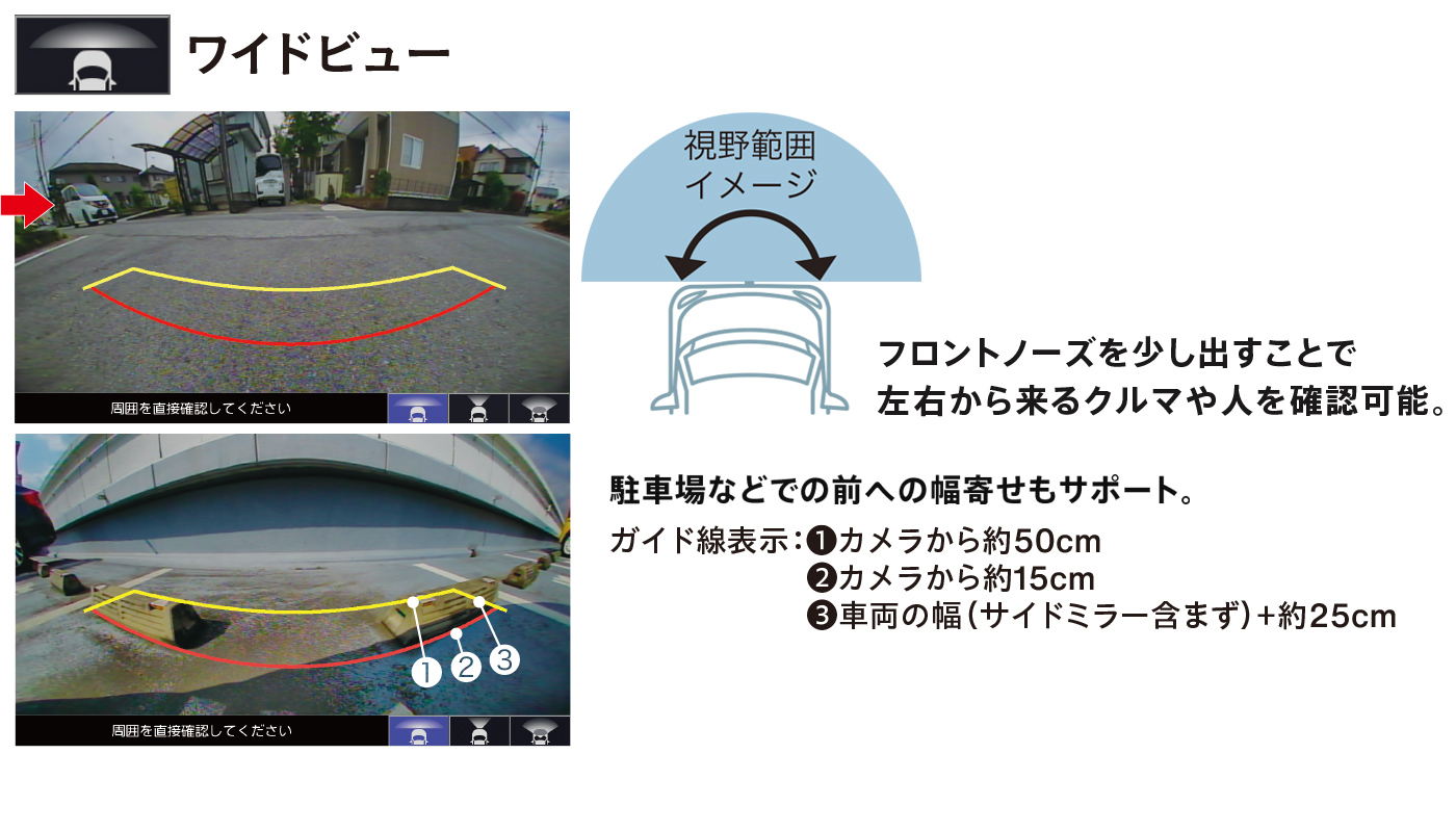 狭い路地や駐車場などでクルマの前方向の視界をサポートします。