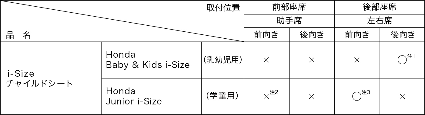 助手席シートを一番後ろに下げ、SRSエアバッグから出来るだけ遠ざけて取り付けてください。 - 注3:シートベルト固定のみ装着可能です。