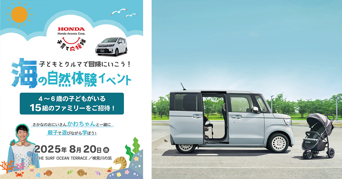 株式会社ホンダアクセスは、2025年8月20日(水)に子育て期の親子向けに自然の体験とパパママを応援するHonda純正アクセサリー装着車の体感ができる「ホンダアクセス子育て応援隊 海の自然体験イベント」をTHE SURF OCEAN TERRACE(千葉県千葉市美浜区)にて開催します。