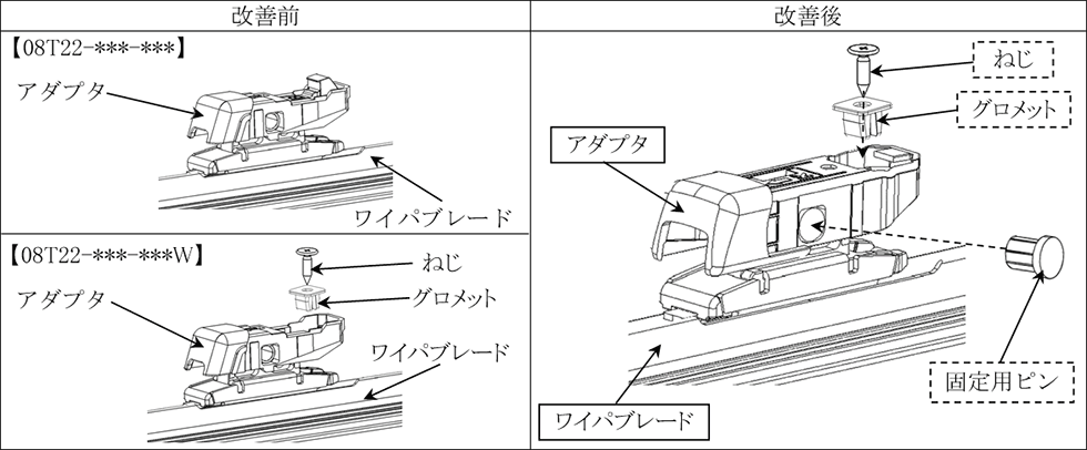 ①②ともに、ねじ固定とピンを追加した新品ワイパーブレードに交換します。なお、使用者へ当該不具合の内容を周知するとともに、使用時の注意点を案内します。 |