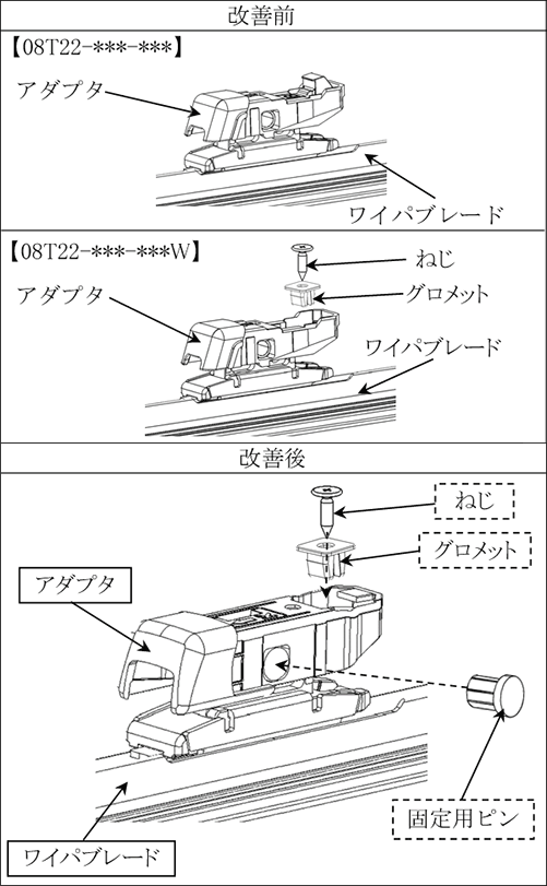 そのため、アダプタが破損し、ワイパー作動によりワイパーアームからブレードが外れ、必要な視野を確保できなくなるおそれがありますので、下記の通り自主改善を実施させていただきます。