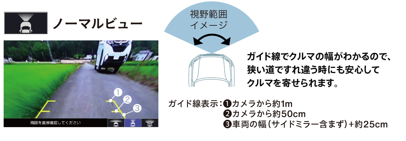 狭い路地や駐車場などでクルマの前方向の視界をサポートします。