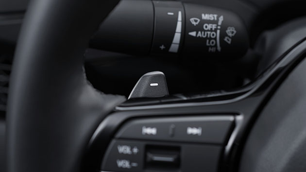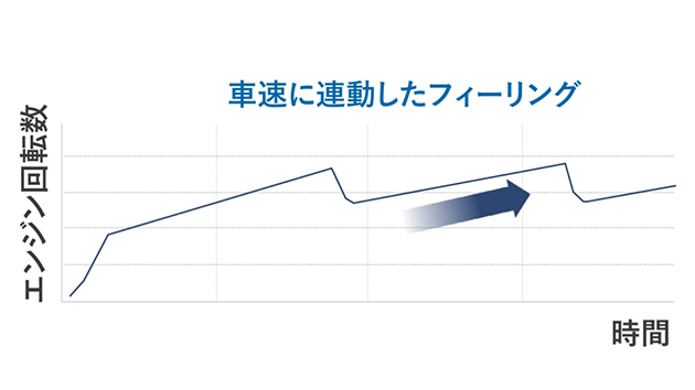 アクセルペダルの踏み込みに連動して加速度を立ち上げるとともに、車速の伸びと連動してエンジン回転数を段階的に制御。有段トランスミッションのようなリズミカルなエンジン回転数の変化とエンジン音で、加速との一体感のある走りを提供します。