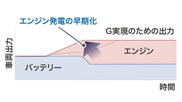 ドライバーのアクセル操作に応じて、エンジンを速やかに始動し発電、ドライバーの感覚とマッチするダイレクトな加速感を提供します。