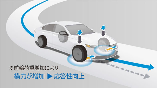 センサーがカーブでの旋回を検知するとモーターのトルクとブレーキを統合制御し、減速をかけることで前輪に荷重を載せ、車両挙動をコントロールし旋回しやすくするシステムです。連続するカーブやきついカーブ、雨や雪の日などでも、さらなる安心感が得られます。