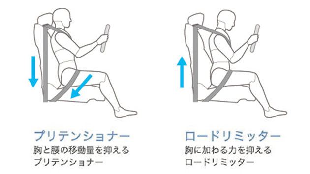 運転席/助手席のシートベルトは、前方向からの強い衝撃を感知すると瞬時にシートベルトを巻き取り、体をしっかり固定します。その後、一定以上の荷重がかかると、シートベルトを少し送り出し、胸などへの負担を軽減します。さらに、ショルダー側のプリテンショナーに加え腰ベルト外側にもプリテンショナーを採用。乗員の拘束効果をいっそう高めることにより、傷害の軽減を目指しました。