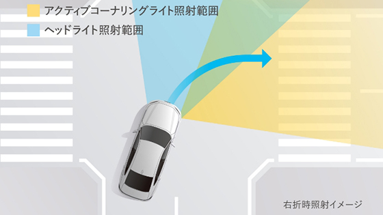 ヘッドライト点灯時、ステアリングやウインカーを操作すると、曲がろうとする方向の内側の路面を照らし、右左折時の歩行者などをより見やすくします。