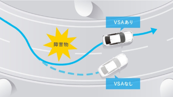 - ABSは滑りやすい状況での制動時に車輪ロックを防止。EBDはブレーキング時の前輪と後輪の制動力配分をコンピューターがコントロールし、制動ポテンシャルをフルに引き出します。EBD付ABSは、あくまでもドライバーのブレーキ操作を補助するシステムです。VSAはあくまでもドライバーのブレーキ操作やアクセル操作等を補助するシステムです。したがって、EBD付ABSやVSAがない車両と同様に、コーナー等の手前では十分な減速が必要であり、ムリな運転までは制御できません。安全運転をお願いします。