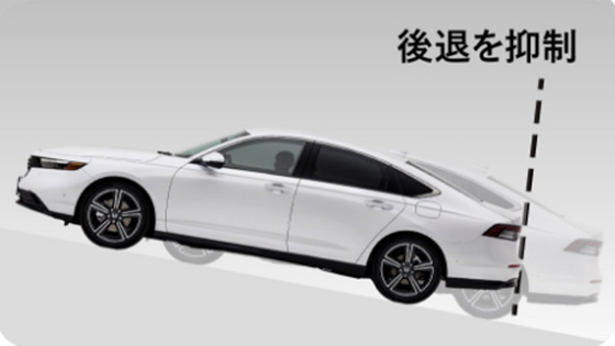 坂道発進時、ブレーキからアクセルへ、ペダルを踏み替える瞬間のクルマの後退を約1秒間抑制します。