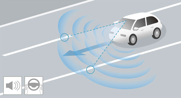 - 車線維持支援システム(LKAS)は、約65km/h以上で走行中に作動します。運転者のステアリング操作に代わるものではありません。運転者がステアリングから手を放した状態や、運転者が意図的に車線を越えるようなステアリング操作をしているとき、また、ウインカーを作動させている場合には作動しません。高速道路や自動車専用道路を運転するときに使用してください。