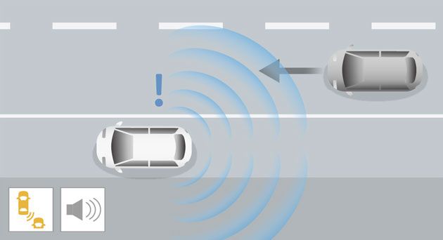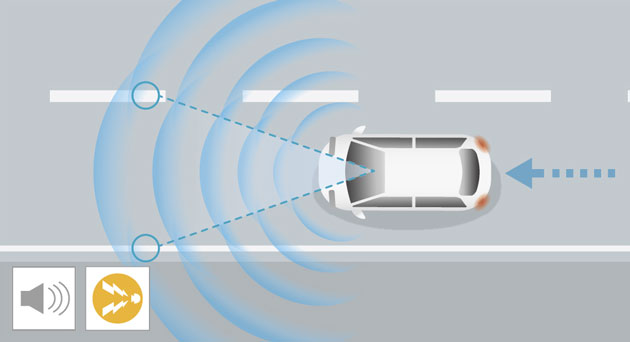 駐停車中、自車側方を通過するクルマ、バイク、自転車等の車両を検知して警報でお知らせします。