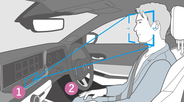 近赤外線ライトを内蔵したドライバーモニタリングカメラを新搭載。ステアリングへのハンズオン/オフを検知するハンズオンセンサーとともに、ドライバーの顔の向きや目の開閉状況、動作の有無などの状態を検知し、システムからの操作要求に対応できる状態かどうかを見守りながらシステムを作動させます。