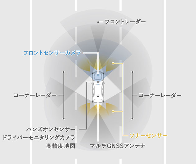 高速道路および自動車専用道路において渋滞追従機能付アダプティブクルーズコントロール(ACC)、車線維持支援システム(LKAS)が作動しているときにシステムが自車の位置を特定するとともに道路情報を取得し、一定の条件下において、ステアリングから手を離した状態での運転(ハンズオフ)を支援します。