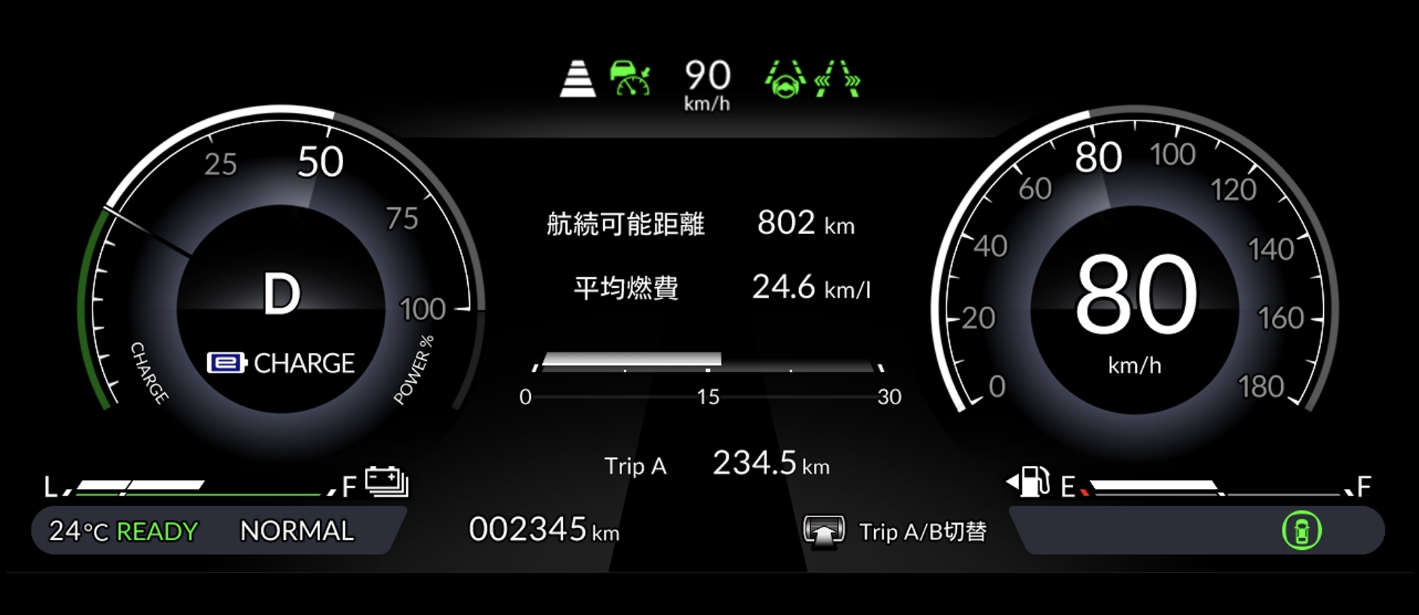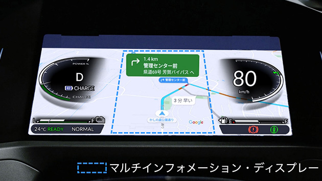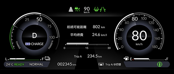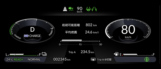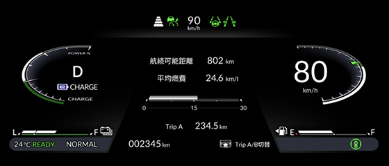 マルチインフォメーション・ディスプレー(ナビゲーション/エネルギーフロー/経過時間/オドメーター/トリップメーター/平均車速/平均燃費/瞬間燃費/推定航続可能距離表示機能 など)