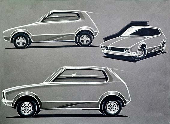エクステリアはトランクスペースを大胆に削った、日本ではまだ珍しい台形型デザインができ上がった。トレーインパネ、センターメーターパネル、タコメーター、フューエルメーター、水温系などを独立方式でレイアウト。タイプは、2ドアと3ドアハッチバックが用意された。