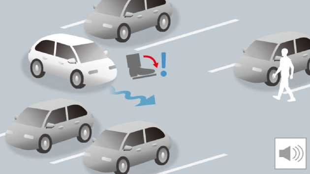 - 歩行者事故低減ステアリングは、約10km/h~約40km/hで走行中、システムが歩行者側への車線逸脱と歩行者との衝突を予測したときに、ステアリング操作による回避を支援します。運転者のステアリング操作に代わるものではありません。運転者が加速やブレーキ操作、急なステアリング操作を行っているとシステムが判断したとき、また、ウインカーを作動させている場合には作動しません。