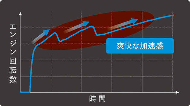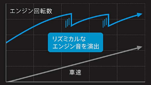 アクセル全開などで強い加速を行う際、エンジン回転数を段階的に制御することで、有段トランスミッションのような変速を実現。リズミカルな加速感と、エンジン回転数や音の変化が一体となった爽快な走りをもたらします。