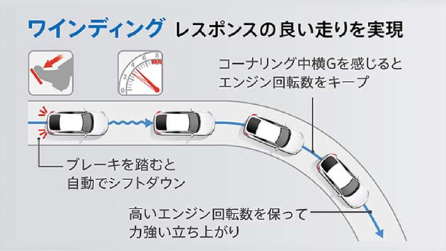 一定以上強くブレーキを踏み込んだ際、エンジン回転数を高く保ちながら段階的にシフトダウン。エンジンブレーキによる制動力を確保するとともに再加速時のレスポンスを向上させます。コーナリング中は、横Gを検知してエンジン回転数を高く保ち再加速を支援します。