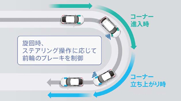 コーナリング時、ブレーキを緻密に制御し、ステアリングを切り始めた際の回頭性や旋回中のライントレース性を向上させる旋回支援システム。
