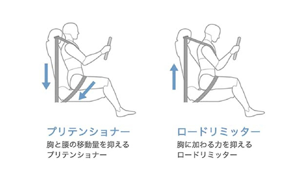 運転席/助手席のシートベルトは、前方向からの強い衝撃を感知すると瞬時にシートベルトを巻き取り、体をしっかり固定します。その後、一定以上の荷重がかかると、シートベルトを少し送り出し、胸などへの負担を軽減します。さらに、ショルダー側のプリテンショナーに加え腰ベルト外側にもプリテンショナーを採用。乗員の拘束効果をいっそう高めることにより、傷害の軽減を目指しました。