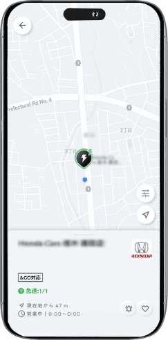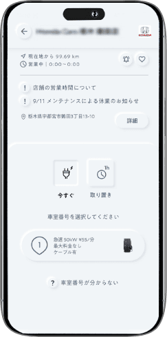 Honda Chargeアプリのマップ画面から利用したい充電ステーション、そして車室番号と充電出力を選び、「今すぐ充電」を押してください。