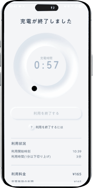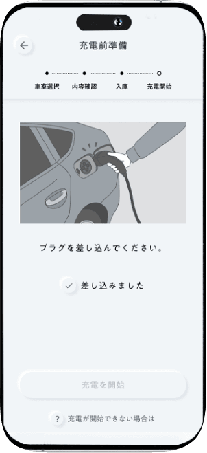 現地に到着したら、お支払い方法などを確認後「利用を開始する」を押してください。車と充電器をプラグでつなぐと充電が開始されます。