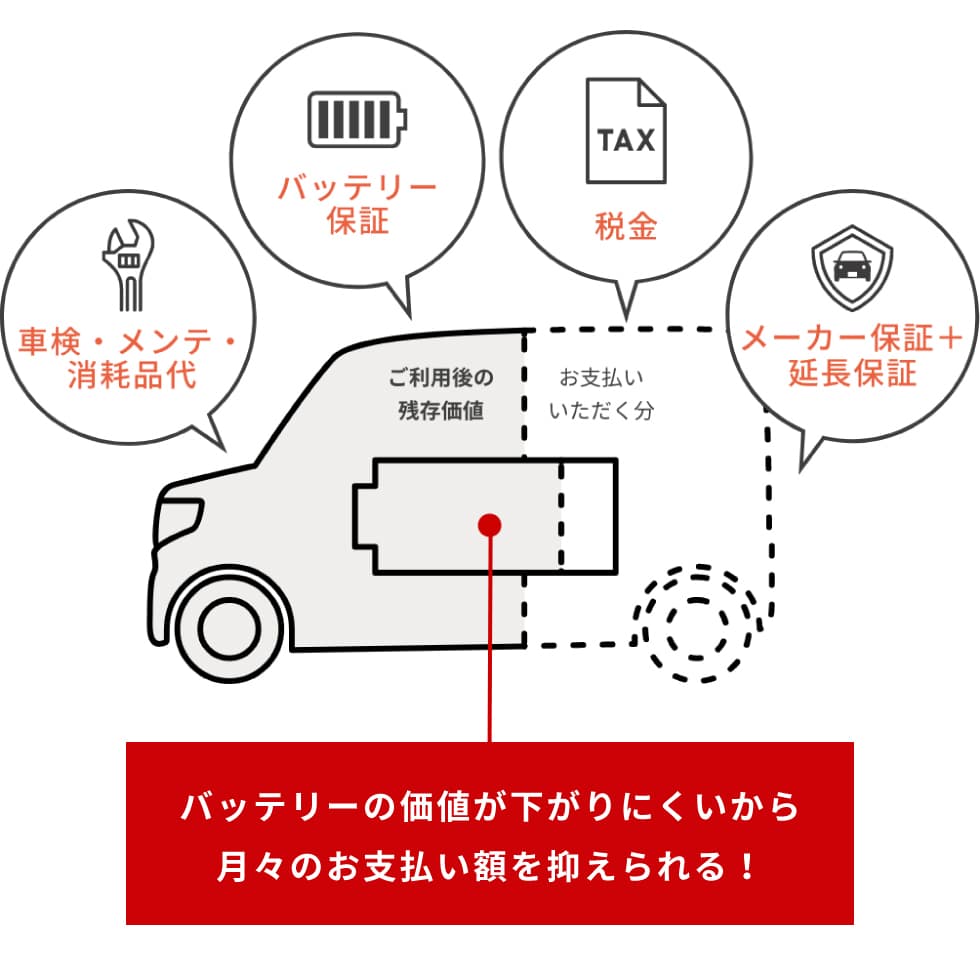 Honda ONだけの「N-VAN e: バリュープラン」では、クルマの買取保証額“残価”を除いた車両代金と、税金やメンテナンスなどの維持費をまとめて、月々定額でご利用いただけます。さらにクルマで利用したバッテリーは、蓄電池事業などで再利用されるため、全部コミコミで、グッとお得な価格でご利用いただけます。