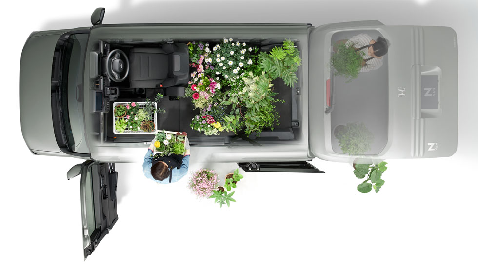 エンジンはクルマの前方へ、しかもコンパクトに。Honda独自の技術「センタータンクレイアウト」で、燃料タンクは前席の下に。そのぶん荷室の床をとことん低くして、タテに広がる大空間を実現しました。