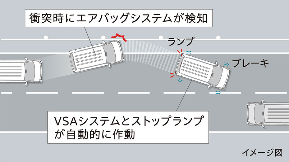• 衝突後ブレーキシステムは、走行中に前方向または横方向からの衝突により、エアバッグまたはシートベルトプリテンショナーが作動したときに作動します。ただし、システムを構成する部品が破損している場合は作動しません。本システムは、必ずしも二次衝突の被害を軽減できるとは限りません。事故の状況によって効果は変わります。衝突が発生した場合は、周囲の状況を確認し、適切に車両を操作して停車させてください。