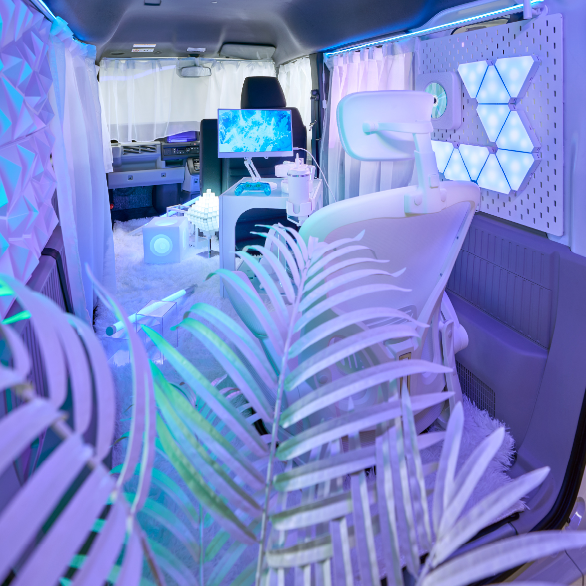 ホワイトだけでなく、ブルーやパープルのネオンを輝かせることで、クールでありながらミステリアスさも演出したSFサイバー空間に。