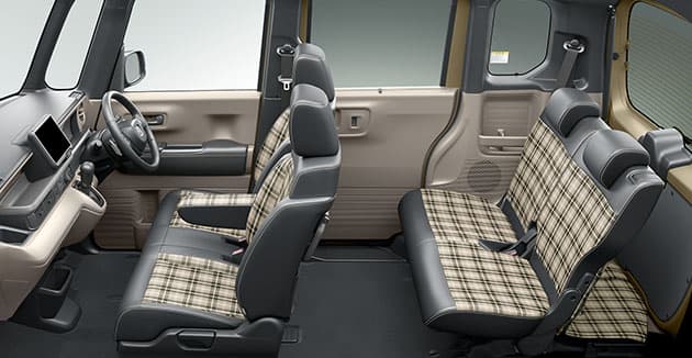 室内のチェック柄ファブリックには撥水素材を採用。飲み物をこぼしてもサッと簡単に拭き取れます。