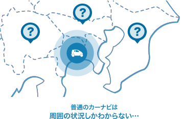 世の中の多くのカーナビは「自分の周り」の「今」の状況しか知ることができない。たとえば県境をまたいだ、その先の交通状況はもう分からない。だからとりあえず、目の前の渋滞を避けたルートを案内する。たとえそのルートの先に、もっと大きな渋滞が待っていたとしても・・・