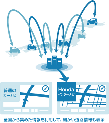 全国の情報が集まるVICS。実は主要な道路の情報しかない。もっと細かい道の情報まで集めたい・・・そして考えたのが「今、走っているHonda車から 情報をもらう」発想。みんなで情報を集めるから、たくさんクルマが参加するほど早い道がみつかる。つながること。これこそがインターナビの真骨頂。