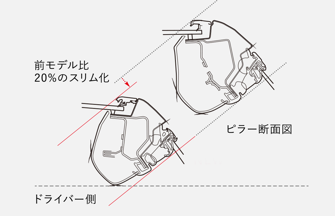 シートに座り、最初に驚くことが圧倒的な視界の良さ。実現したのは、フロントシートを内側にレイアウトすることで、視野角を広げるという発想。さらに、フロントピラーの位置を後方に引くとともに、スリム化を実現。視界を広げるとともに、美しいロングノーズデザインにも貢献しています。