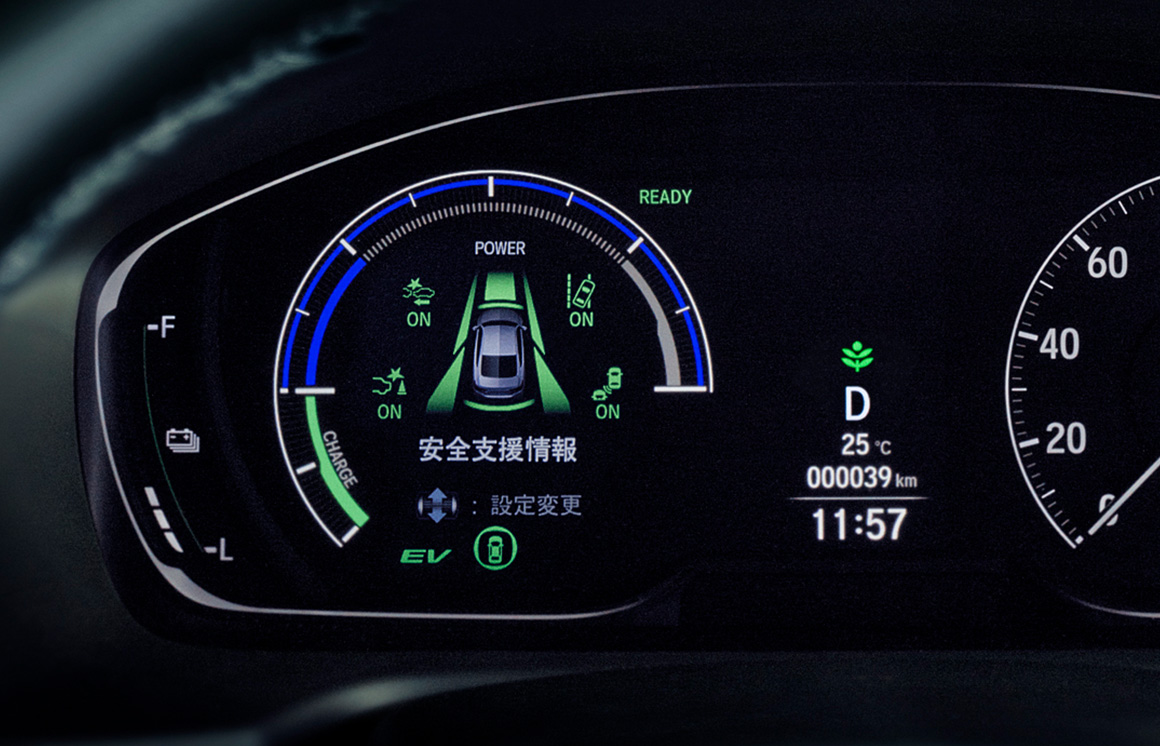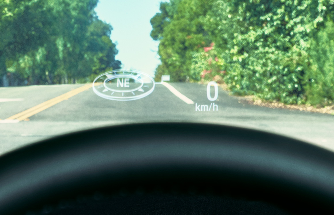 運転中、速度や道路標識などをフロントウインドウに投影することで、少ない視線・焦点移動で、必要な情報を読み取れるようにする、ヘッドアップディスプレーを採用。道路標識や、駆動力の配分状況なども表示します。