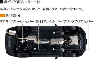 路面側に出ていたフロントフロアフレームをボディの内側に配置したインナーフレーム構造に加え、フロントフロアカバーやリアサブフレームカバーなどにより、ボディ下面のフラット化を徹底。さらに、フロントバンパーのコーナーをわずか数ミリほど外に張り出してエッジを作る処理やフロントグリル開口部形状の変更とあわせ、空気抵抗を徹底的に抑え、燃費性能や高速走行時ののびの向上を実現しています。さらに、ボディ下面のフラット化の徹底は、リフト(揚力)の低減と前後リフトバランスの最適化にも寄与し、高速走行での安定感の向上も実現しています。