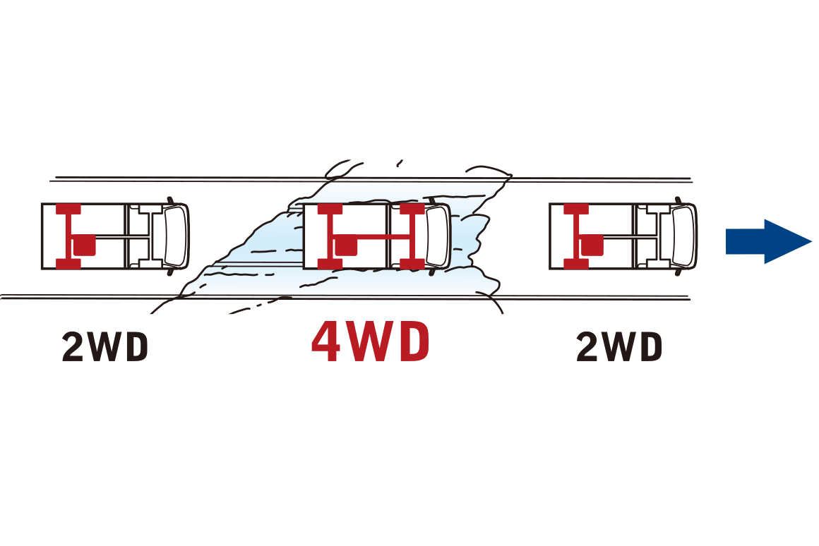 通常はほぼ2WD(後輪駆動)状態で走行。滑りやすい路面になると自動的に4WDに切り換わり力強く走ります。