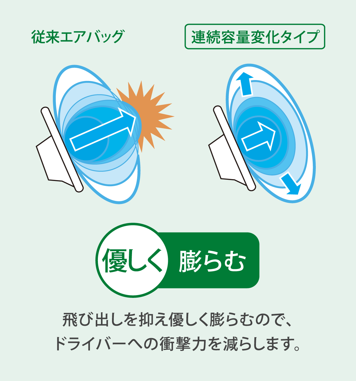 さまざまな体格の方や衝突状況に対応するとともに、乗員保護性能の向上と、エアバッグによる衝撃力の低減の両立をめざした「連続容量変化タイプ」の運転席用エアバッグを全タイプに標準装備しています。