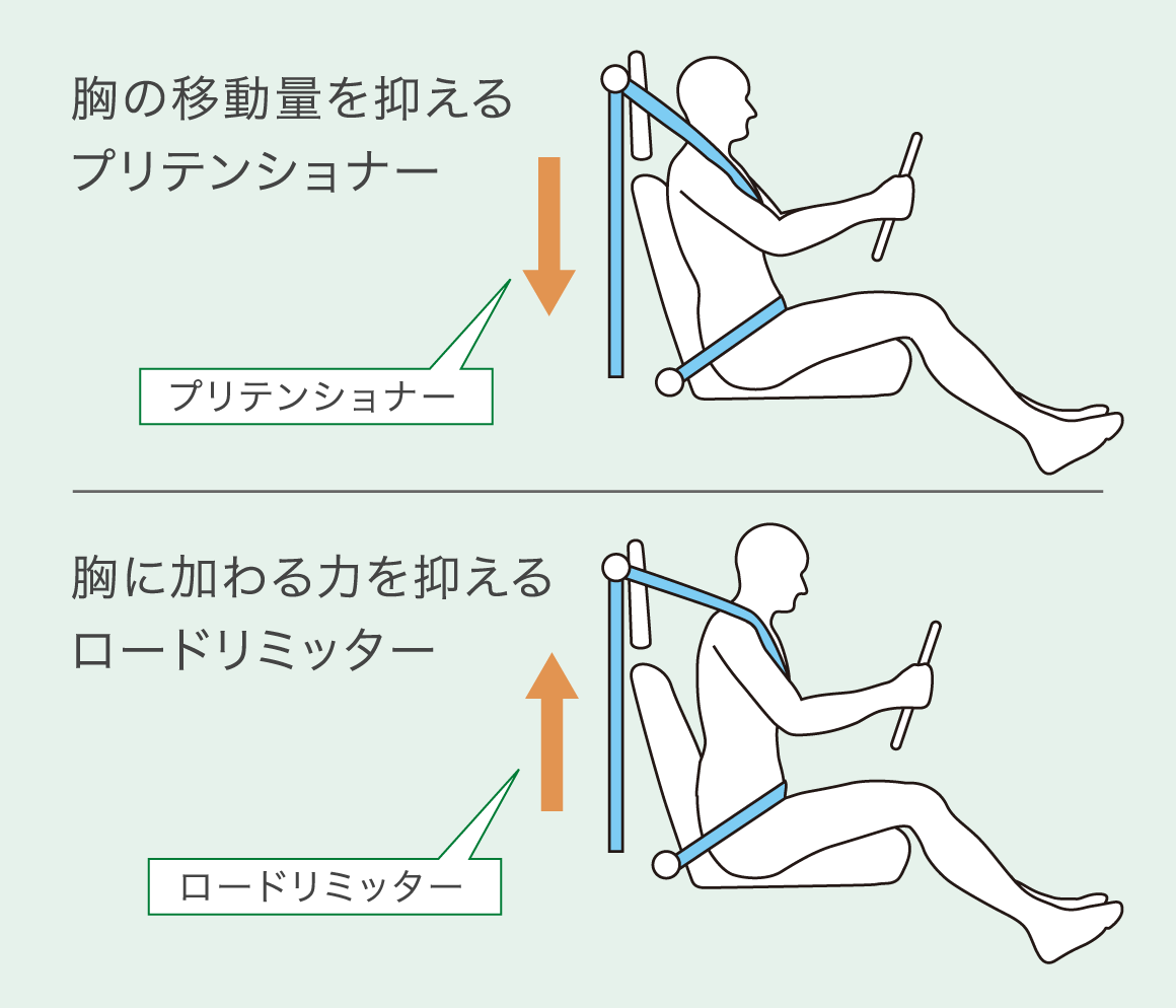 前方向からの強い衝撃を感知すると、シートベルトを瞬時に巻き取り、その後、一定以上の荷重がかかると、シートベルトを少し送り出し胸などへの負担を軽減します。